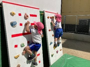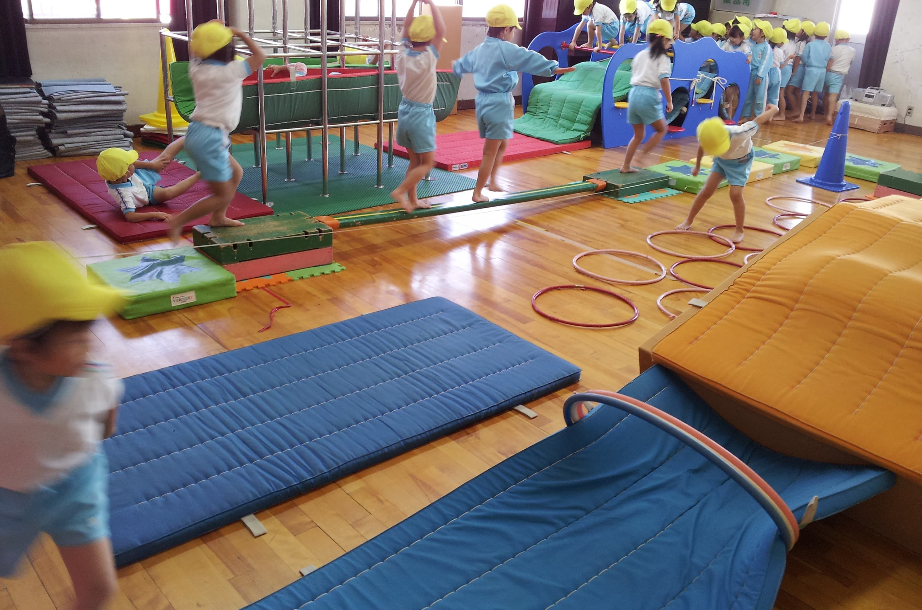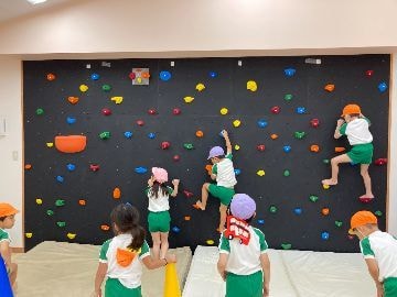 各年齢に見合った「小さな目標(スモールゴール)」を設けて、できたことを認め、次への行動意欲を促します。 マット運動、跳び箱、鉄棒、ボール、縄跳び、手具などの今後に必要とされる動きを多く取り入れ、短い時間でも十分に何度でも技能獲得へのチャレンジが経験できます。